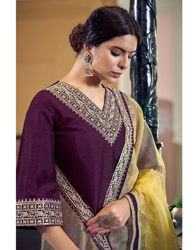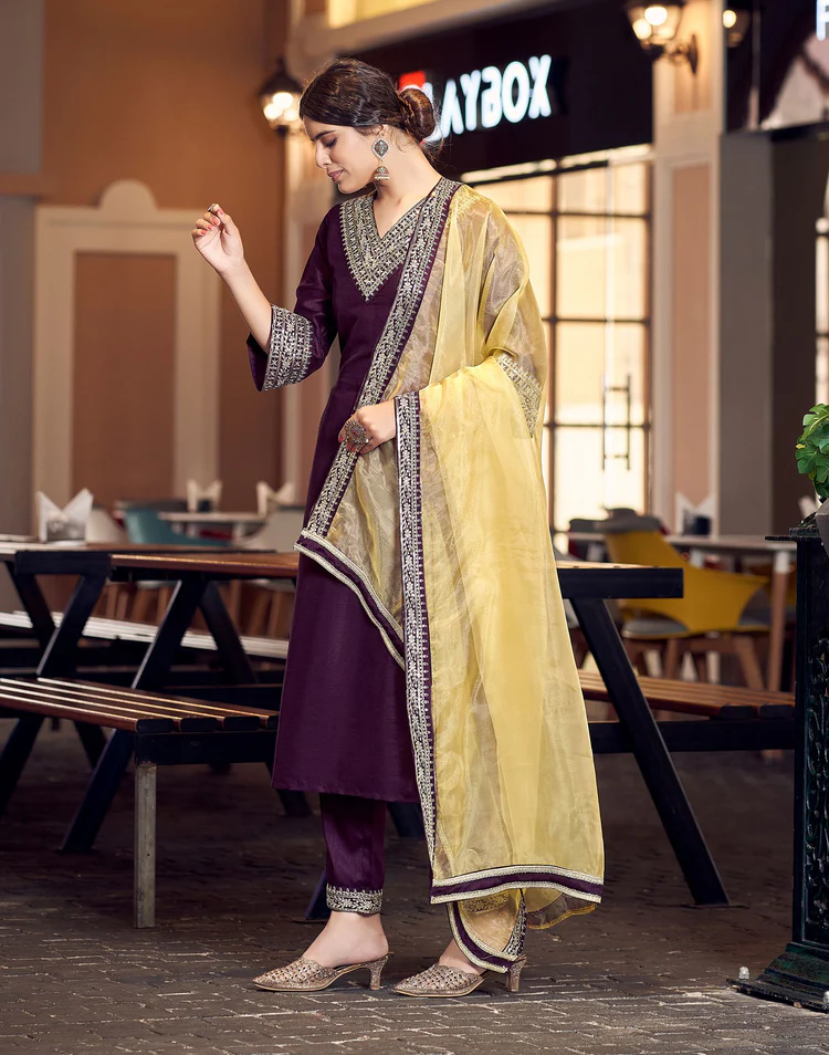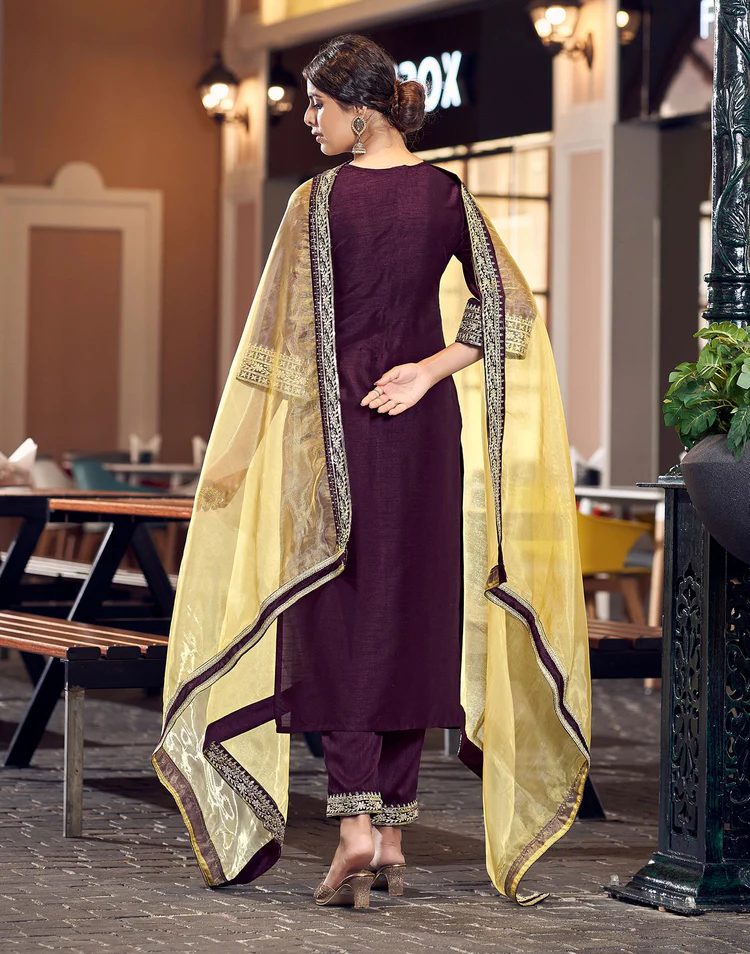 Wine Plain Silk Straight Kurta With Pant And Dupatta